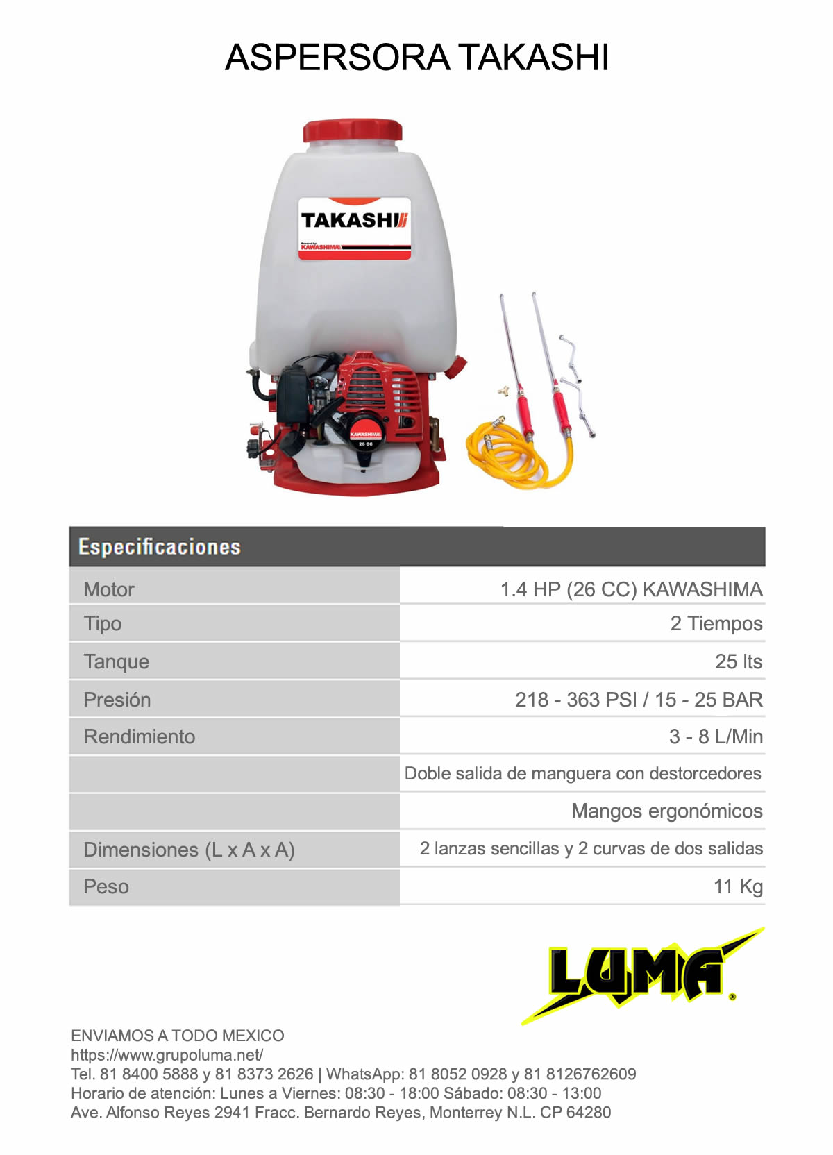 ASPERSORA A GASOLINA PARA FUMIGAR Y/O SANITIZAR TAKASHI 25 LITROS